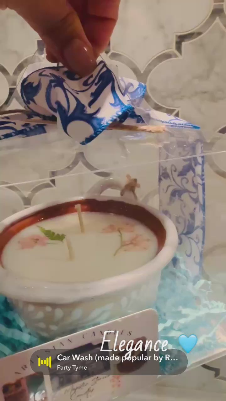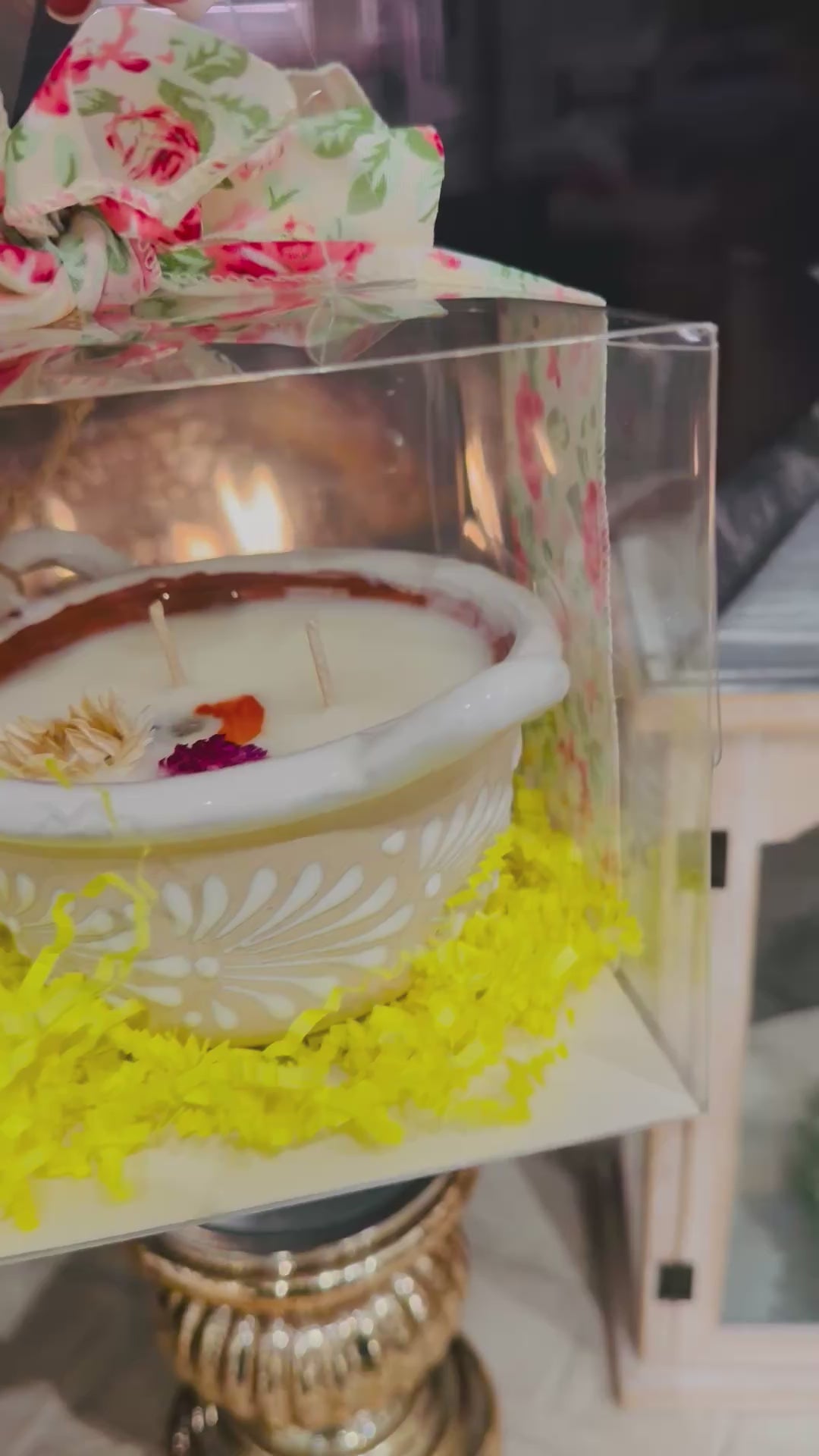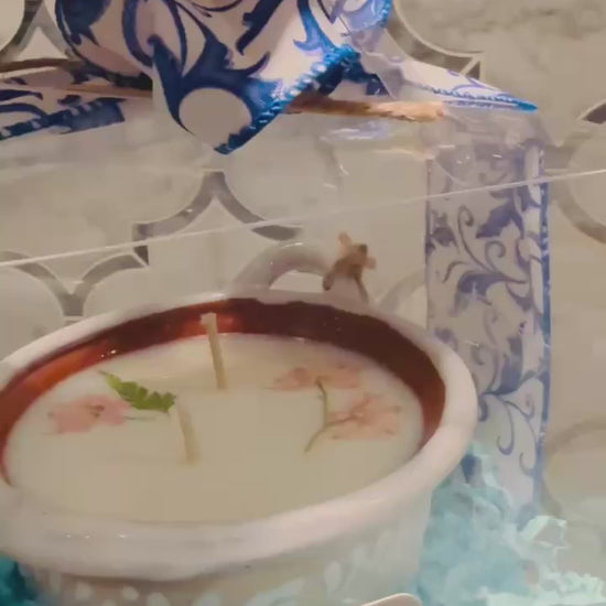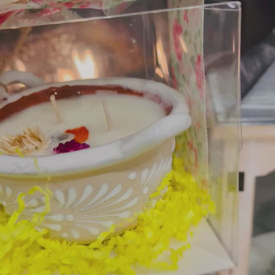 Indulge in the luxurious scents in this beautiful Elegant White Cazuelita Candle. Measuring 3.25 inches in height and 6.5 inches in width, this 10 ounce hand poured candle beams with the colors and accents. The candle is adorned with natural dried flowers.